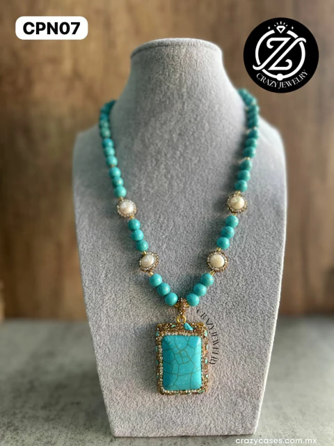 Collar piedras naturales y bronce - Azul turquesa y perlas